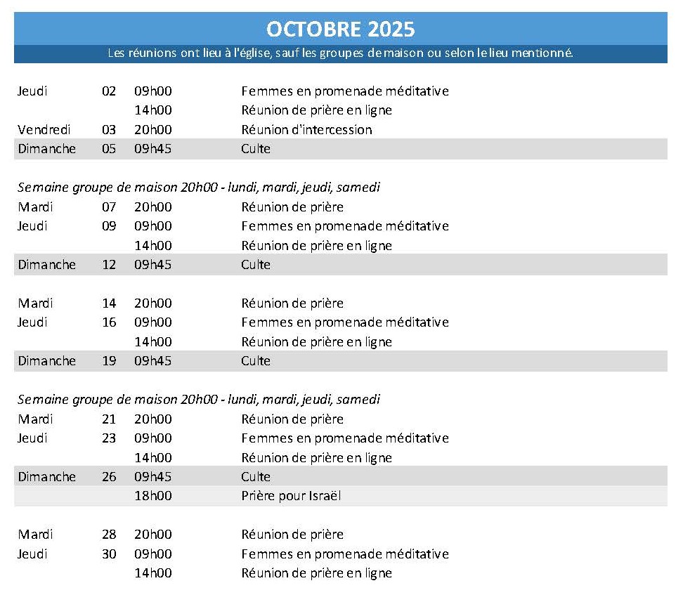 Les réunions ont normalement lieu à l'Eglise Evangélique de Réveil, sauf les groupes de maison et parfois le groupe de jeunes.